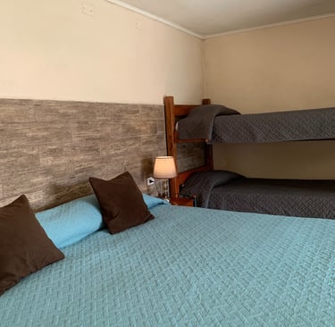 Habitaciones cómodas con entrada independiente, equipadas con una cama matrimonial y un camarote, diseñadas para que puedas moverte con facilidad. Incluyen baño privado y televisión, ideales para un descanso reparador. Cuentan con ropa de cama y sábanas.